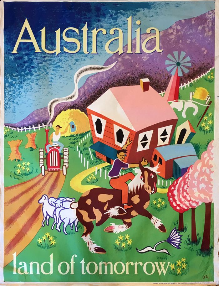 Commissioned in 1948 and issued by the Commonwealth Department of Information, the poster was part of the post-war drive to encourage immigration to Australia. With a print run of 75,000 the poster was widely distributed across the displaced persons camps and hostels in post-war Europe 1949~51.