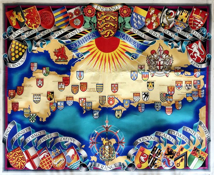 The poster shows the extent of the Southern Rail network with the shields of the counties above and the county towns on the map. The crests of the main French ports are also shown, giving a discreet nod the important cross channel holiday business Southern Rail wished to promote.